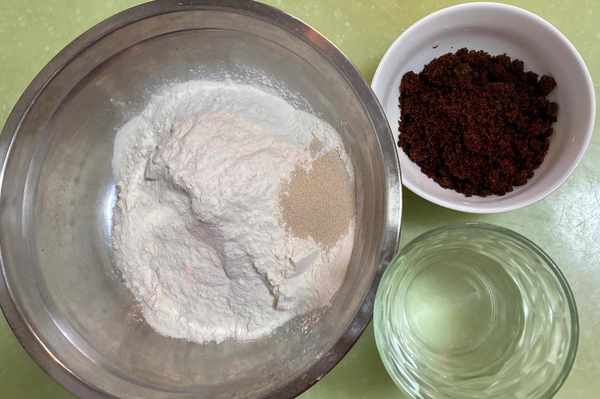 【材料】300克面粉,3克酵母,70克紅糖,150克水。