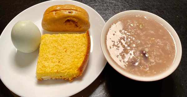 早餐一碗雜糧粥配一個紅糖饅頭,一塊蛋糕和一個咸鴨蛋,吃的暖和和,甜滋滋!