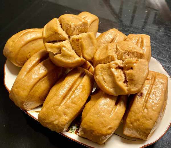 圖中有兩個開花饅頭形狀的紅糖饅頭,做法簡單,隻需要把面劑子搓成圓形,然後用刀在上面畫一個十字口,二次發酵以後就變成開花饅頭的形狀。