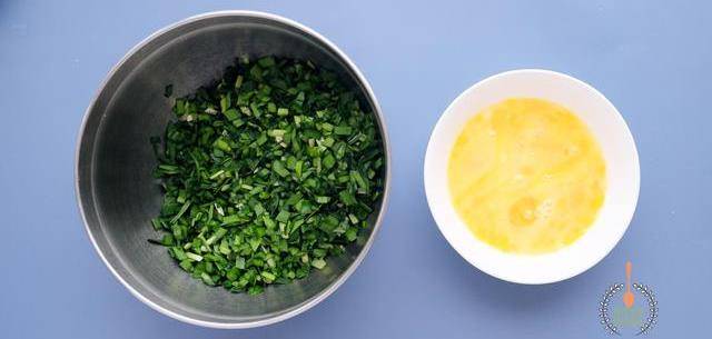 2在等待發酵的時候,將韭菜洗幹凈控幹水,切成小段。如果沒有來得及提前洗韭菜晾曬,可以用幹凈的廚房佈擦幹。雞蛋打撒放入碗裡,加1g鹽攪拌均勻。