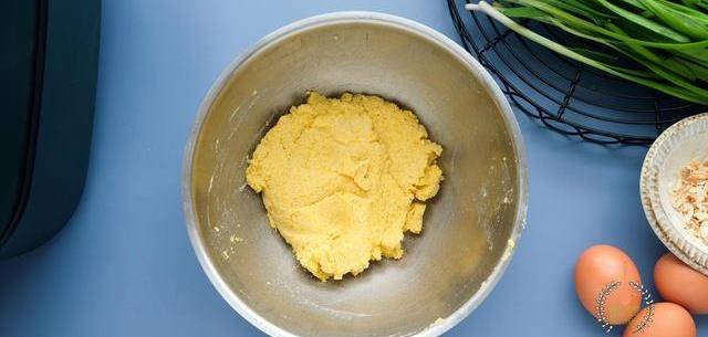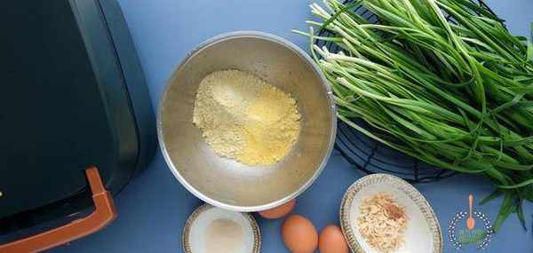 【材料】玉米面100g、黃豆面50g、溫水120g、酵母1g、韭菜250g、雞蛋3個、蝦皮50g、鹽2g、油10ml