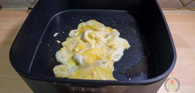 3將新思特多功能鍋預熱,放入少量的油,燒熱後倒入雞蛋液,一邊等加熱一邊用筷子攪拌。這是雞蛋滑嫩的一個小竅門。稍微凝固,然後撈出雞蛋,剁碎。
