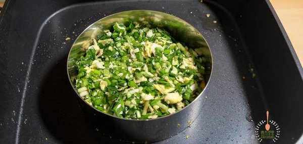5烙餅的同時,將剁碎的雞蛋、蝦皮、放入剁碎的雞蛋裡。