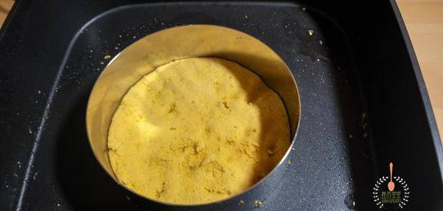 4鍋內無需放油,放一個慕斯圈,將發酵好的玉米面放到慕斯圈裡,壓平。攤完雞蛋的底油完全夠瞭,不用再加油。現代生活還是要少吃油。蓋上鍋蓋,調中火,烙1分鐘。