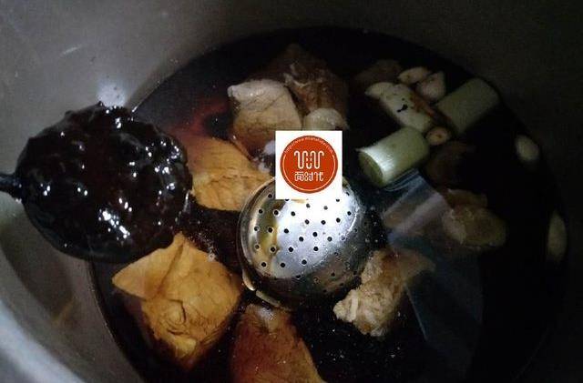 8、再加鹽,生抽,老抽,黃豆醬,蓋上蓋子,大火燒開,轉小火25分鐘左右。