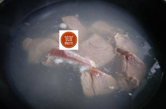 3、鍋中放冷水,放入牛肉,大火燒開,開水煮5分鐘,除去血沫和異味,撈起。