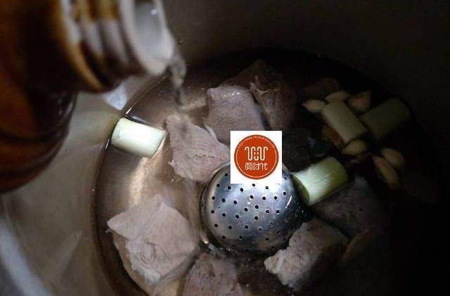 6、鍋內倒入能沒過牛肉的清水,放入調料盒,蒜,薑,蔥段,冰糖。