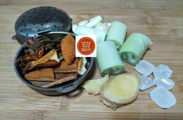 5、把準備好的調料放入調料盒裡面,蒜,薑,蔥段,冰糖備好。