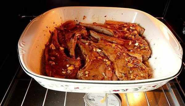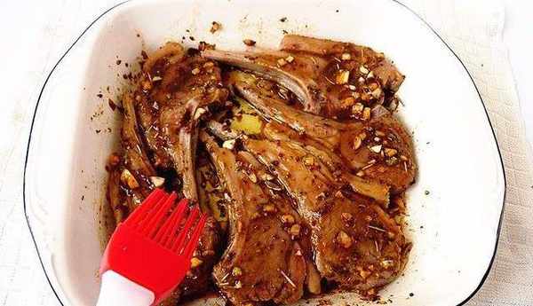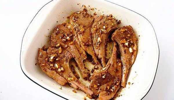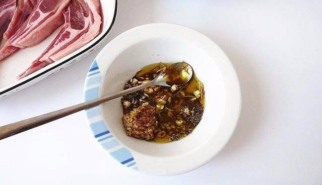 把煎過的羊排用拌好的醃料醃上15分鐘,排放在烤盤裡
