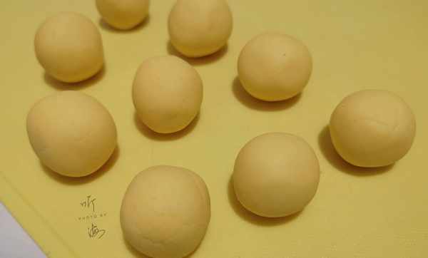 5、再將南瓜面團分成大小差不多的小劑子,再用手揉搓成小丸子。大小可以根據自己的喜好來做。