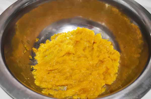 2、將蒸熟的南瓜取出,趁熱用叉子搗成細膩的泥狀,稍稍晾涼備用。