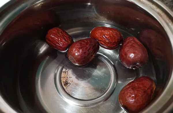 6、紅棗先用清水洗凈。鍋內加入適量水,將紅棗放入鍋內,大火煮開,再繼續煮5分鐘。