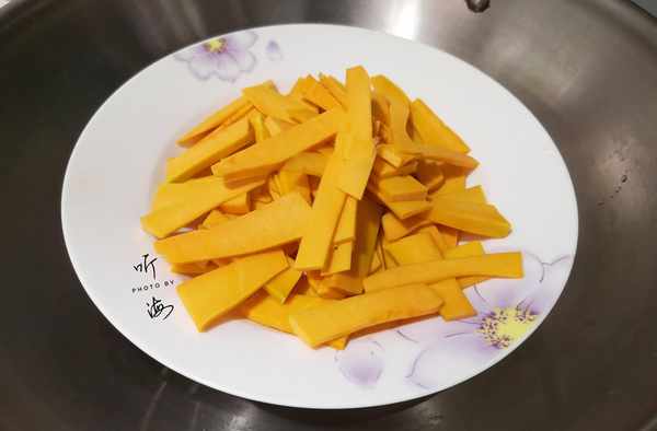 1、南瓜去皮去瓤,切成薄片,鍋內加入適量水,放入南瓜,大火煮開,蓋上鍋蓋蒸15分鐘左右,南瓜軟爛即可。