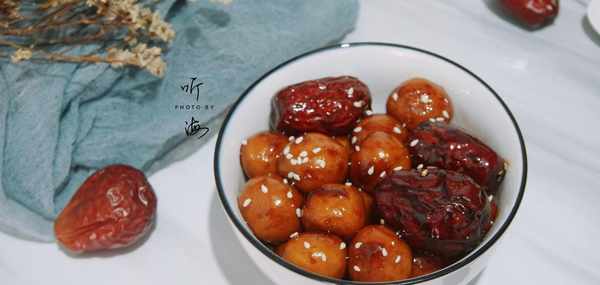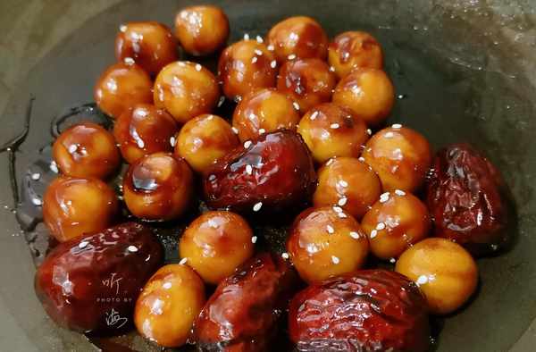 9、再將南瓜糯米丸子和紅棗撈出倒入,開大火不斷翻炒,直至水分全部收幹,湯汁變濃稠,最後再將準備好的白芝麻撒上即可。