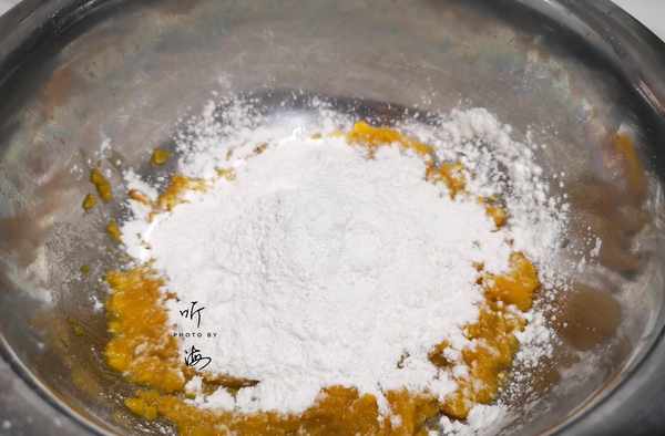 3、將糯米粉倒入南瓜中,攪拌成無幹粉的絮狀。糯米粉不要一次性倒入,少量多次倒入可以比較好的控制用量。