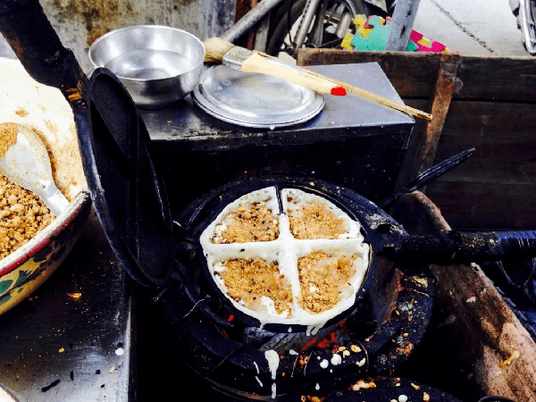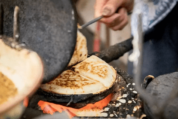 在用炭火預熱的圓形模具裡