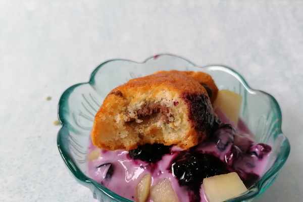 7.把酸奶加進切好的桃子裡,然後把餅幹大力揉碎,蓋在雪白的酸奶頂端。