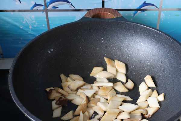 鍋中放入適量食用油,放入杏鮑菇片煸炒到兩面金黃,盛出備用
