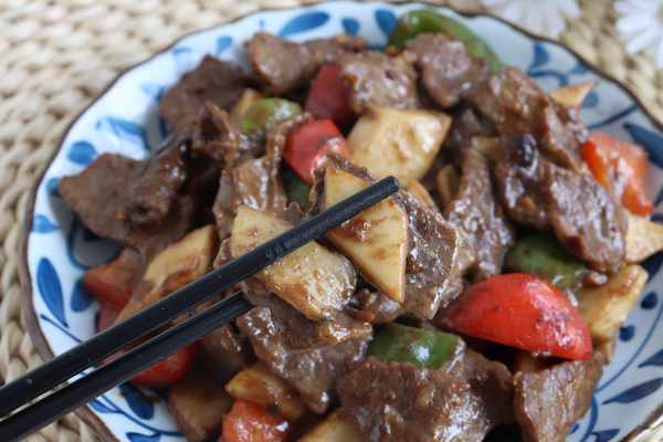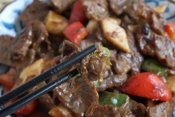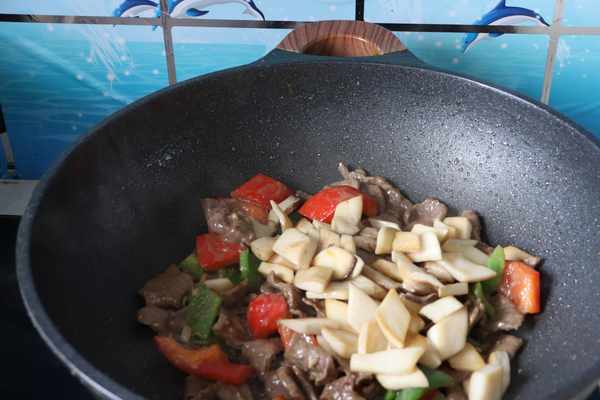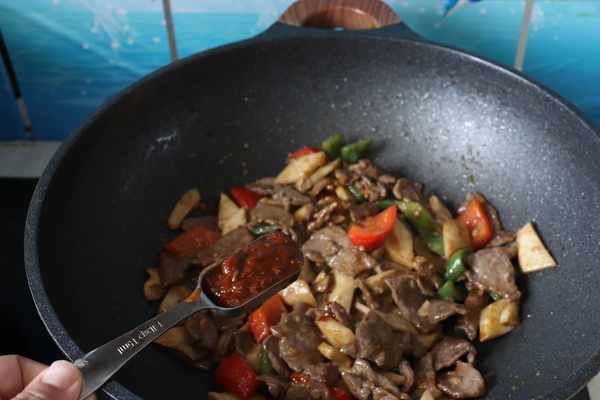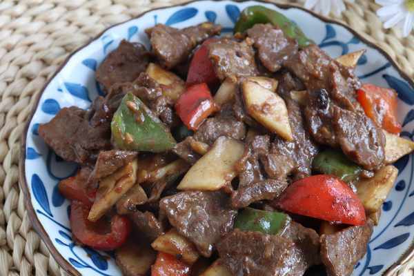 鍋中留底油,放入薑蒜末爆香,放入牛肉煸炒到變色後,放入青紅椒塊,翻炒到變軟