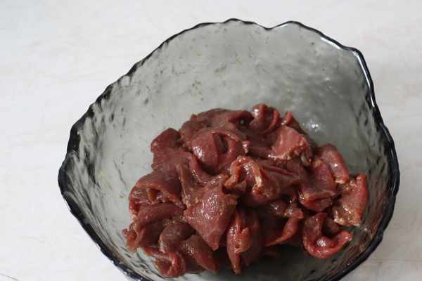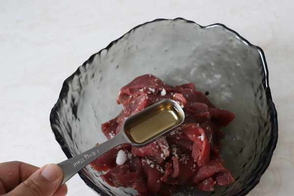 牛肉片中放入半大勺老抽,半大勺白糖,半大勺料酒,1小勺黑胡椒粉,1個雞蛋的雞蛋清,半大勺淀粉,攪勻,然後再放入1大勺玉米油,鎖住牛肉中的水分,醃制10分鐘