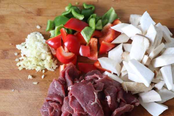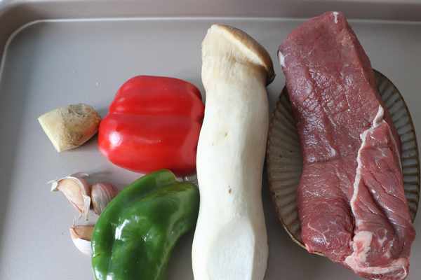 具體制作步驟:準備好所需要的食材並清洗幹凈薑蒜切末,青紅椒切塊,杏鮑菇切片,牛肉切薄片備用
