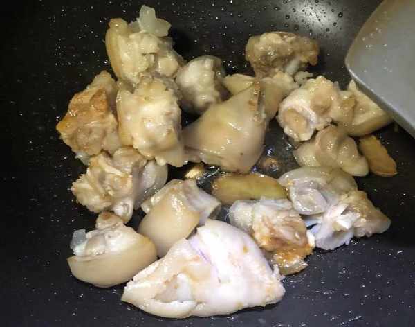 3、接著來炒一下,鍋內放油燒熱,把豬蹄放進去,在不斷翻炒的過程中,水汽揮發幹凈,豬蹄上色。