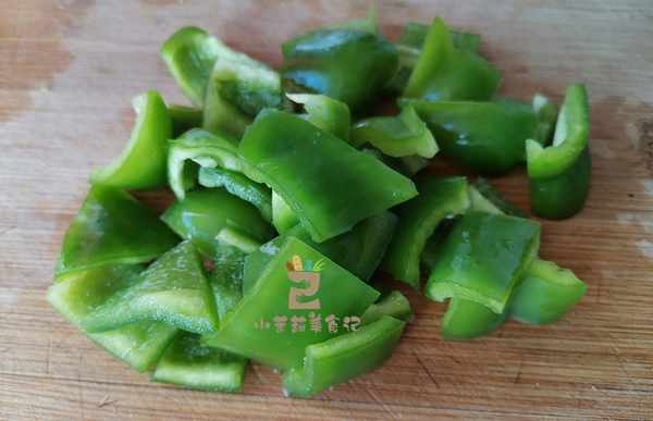 2、搭配一個青椒,洗凈之後掰開,去掉白籽以及白筋,順手掰小塊。
