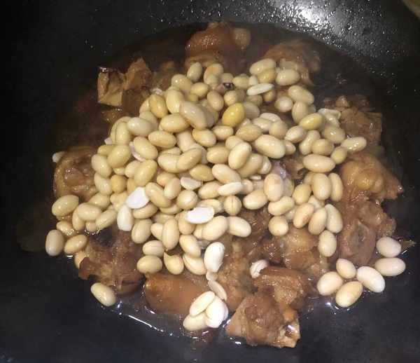 5、黃豆倒進去,與豬蹄拌勻,繼續用小火燉半個小時,讓二者進一步軟爛,最後根據咸淡加鹽,再燜五分鐘,即可關火盛出。
