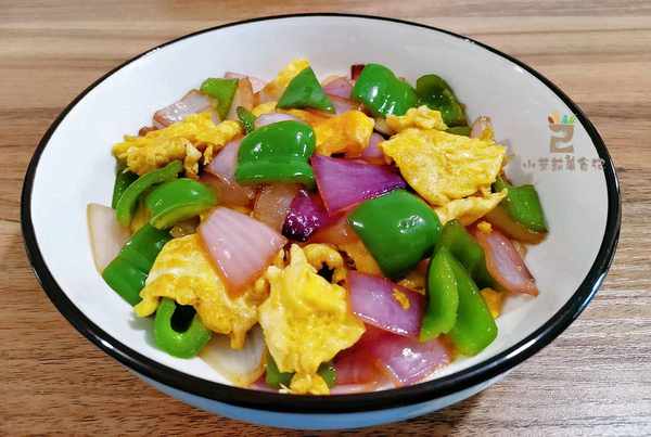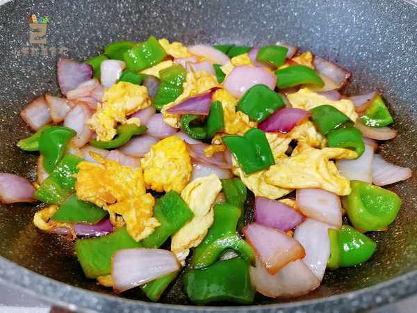 4、鍋內倒一點生抽,在熱鍋中激發出香味,洋蔥和青椒同時倒進去,然後快速翻炒,香味瞬間飄出。待洋蔥和青椒炒熟,把雞蛋第二次放進去,調入一點鹽,繼續炒入味,立即出鍋。