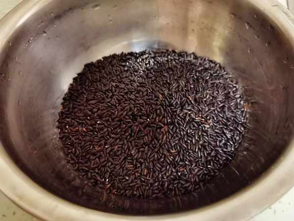 1、先來浸泡黑米,所需時間比較久,為瞭避免等待,我們可以在晚上將其放到冰箱裡進行浸泡。