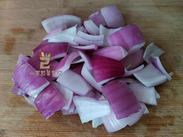 1、來處理洋蔥,最外邊的幹皮剝掉,露出新鮮的部分,先洗幹凈,接著用刀劃幾下,然後剝下來,改刀成小塊。