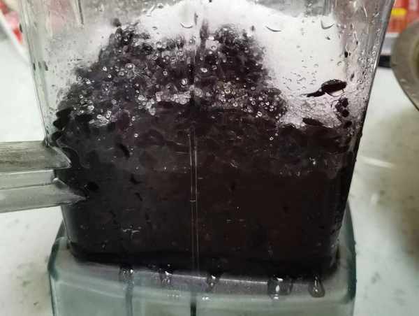 2、第二天我們直接從冰箱裡取出黑米,這時候已經泡軟瞭,我們隻保留一小部分水,與黑米一起倒入料理機中,並且加一點糖,然後攪打細膩。