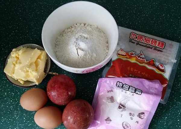 材料:糖粉65克、黃油100克、細砂糖35克、全蛋液100克、低筋面粉120克、輔料:泡打粉2克、百香果汁54克