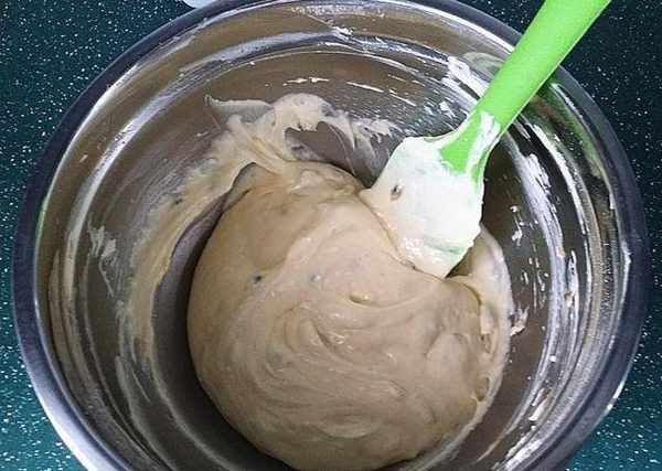 6、此時需用刮刀快速輕盈地不停翻拌、一直拌到面糊很有光澤狀態即可