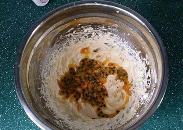 4、將備好百香果切開、取出果汁倒入黃油蛋液中用刮刀充分拌勻PS:最好用篩網將百香果籽過濾掉,那樣吃起來會順口些