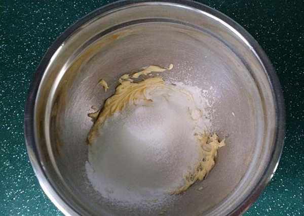 2、接著篩入糖粉和細砂糖,再將黃油打至變白蓬松