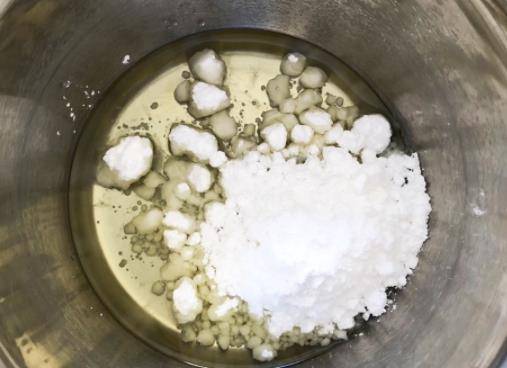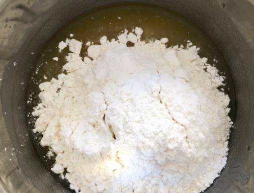 2. 在盆子裡面加入適量的玉米油,再加入糖粉,把它們給攪拌均勻。