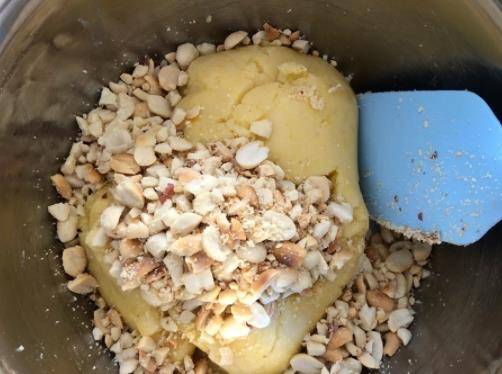 6. 其實花生碎是不需要碾太細,差不多有顆粒感的狀態是更好的,花生最過後我們也就可以直接把它放到面團裡邊揉搓均勻。