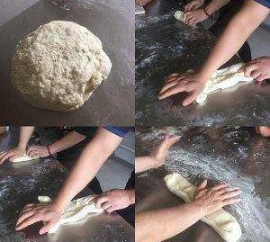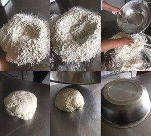 大出一倍後。 揉 (如有粘在案板上的面,用一小塊面團揉掉)。揉至面團光滑。面光滑後,揉成長條