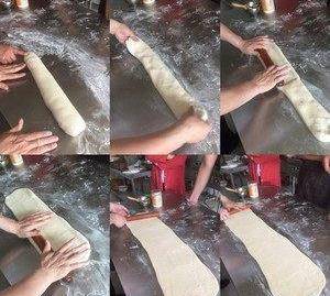 揉成長條後,用搟面杖搟成長方片