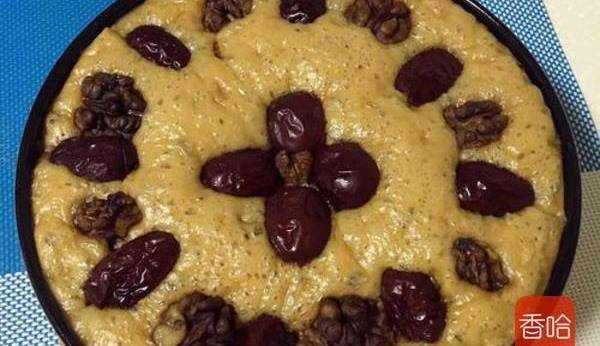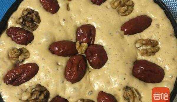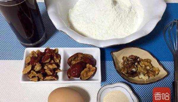 普通面粉260克、酵母4克、雞蛋1隻、紅糖水1杯、紅棗適量、核桃適量、油少許