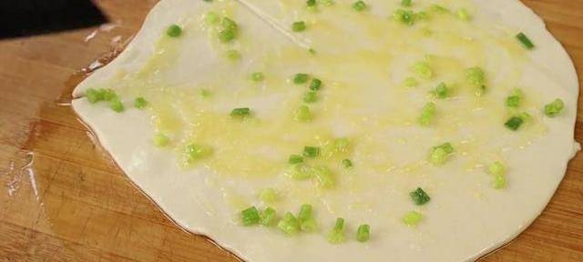 準備一個盤子,底部刷一層油,放上柔軟的劑子,最後在劑子上也刷一層油,蓋上保鮮膜醒面40分鐘。現在做點油酥,碗中加入40克面粉,適量的蔥花和鹽充分攪勻,這樣就調好瞭。面醒好以後把多餘的油倒到案板上,把面劑輕輕壓扁,用搟面杖搟開,最後搟成薄薄的面皮,均勻抹上油酥,用刀切成小三角形,最後一個三角形留大一點。