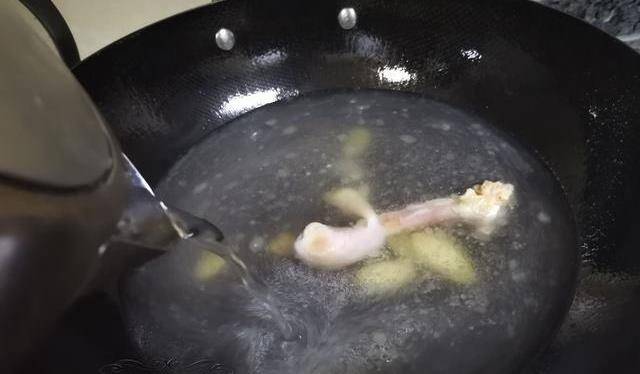 雞腿骨炒至切塊後,加入適量開水,煮沸,水燒開後,蓋上鍋蓋,煮5-10分鐘,煮沸濃白色高湯備用。