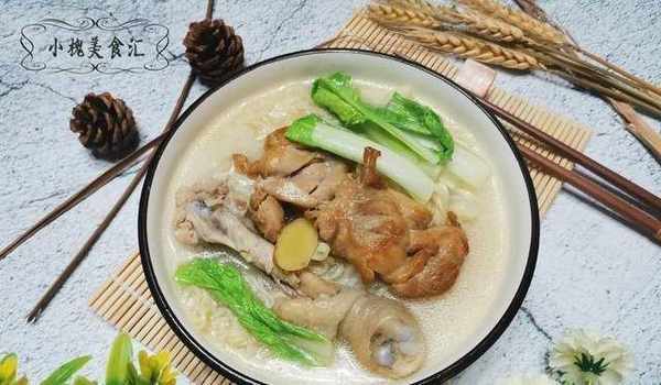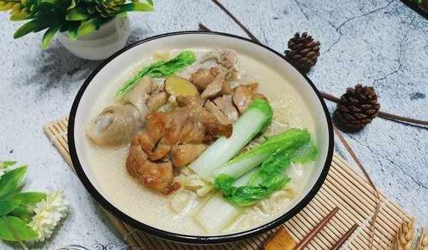 在煮好面條後,加入洗好的蔬菜,然後把水焯一下,在焯水之後,取出面條放在盤子裡。在剩下的湯汁裡加點鹽,用雞精調味。最後,把炸雞腿裹上面條,淋上厚厚的白色湯汁,這碗“點心”面就吃完瞭。