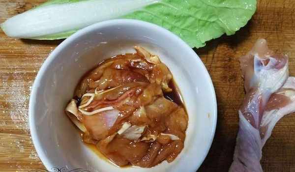 雞腿肉取下後,取一碗,加少許鹽、少許雞精、少許生抽、少許糖,用手抓起,醃10-20分鐘備用;準備幾份蔬菜,洗凈備用;薑洗凈切片備用。