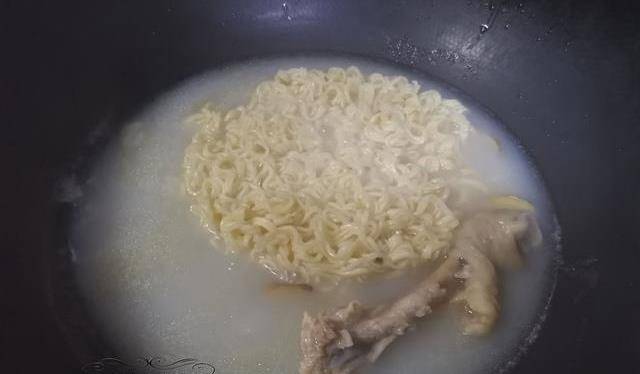 當鍋內的湯汁煮成濃白色時,可以放入準備好面條,蓋上鍋蓋,用大火煮沸煮制3-5分鐘左右。