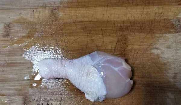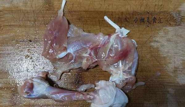 雞腿洗凈後,用刀將雞腿根部切成一個圓圈,從中間切一把刀,把雞腿骨踢開,把雞腿肉完全脫下,把雞腿肉和雞腿骨分開備用。