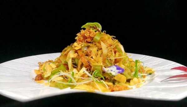 XO醬、蔥白、大蔥、芫荽放入預熱後的鍋爆香,倒入粉絲慢火炒香,再倒入面餅一同翻炒均勻,放入清雞湯繼續翻炒至幹身