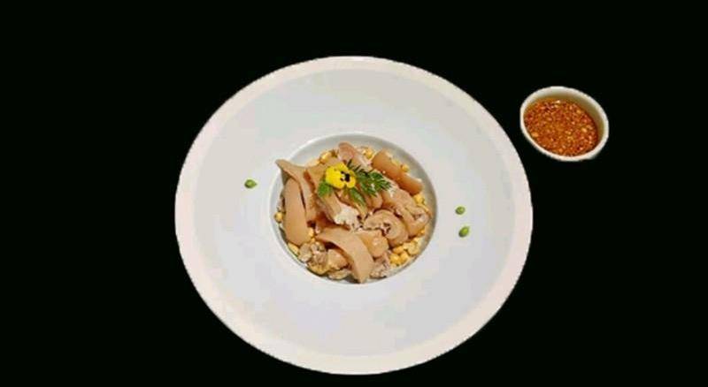 沖洗幹凈的豬手用蔥、薑、胡椒粉、清雞湯一起扣軟去骨,放入冰水中浸泡5分鐘,撈出改刀切好裝盤