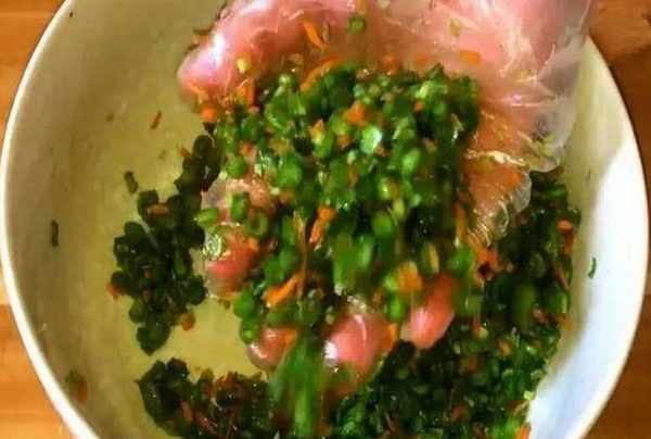 然後把切碎的豆角和胡蘿卜都放入盆中,然後再放入事啦ing的鹽,胡椒粉,十三香,食用堿,然後用手抓勻,然後放置到豆角變成深綠色為止,然後再把豆角中的水分攥出,再放入一點面粉攪拌均勻,然後再抓一點揉成瓷實的圓球,做成窩窩頭的樣子,依次把所有的菜都做好。